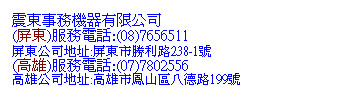 【震東事務機器有限公司】民國 67年 成立至今已有 30 年的歷史,30 年來立足高屏地區 服務客戶,目前專營:【打卡鐘、傳真機、飲水機、收銀機、支票機、標價機、打字機、印時鐘、
